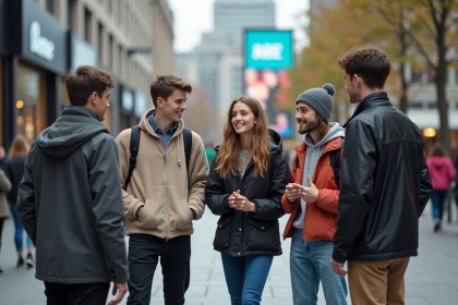 Groupe de jeunes adultes en streetwear devant un panneau digital